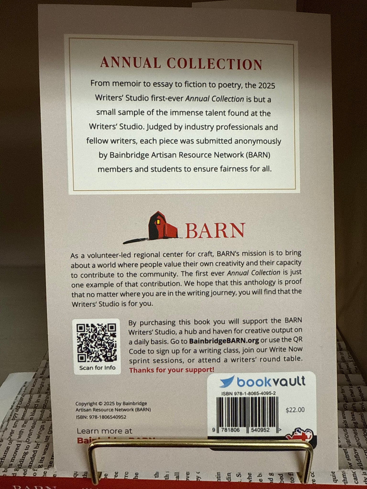 From memoir to essay to fiction to poetry, the 2025 Writers' Studio first-ever Annual Collection is a small sample of the immense talent found at the Writers' Studio. Judged by industry professionals and fellow writers, each piece was submitted anonymously by Bainbridge Artisan Resource Network (BARN) members and students to ensure fairness for all.